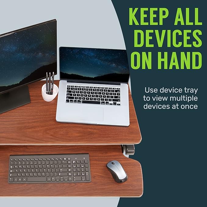 - Large Work Area: At 42" wide, our adjustable standing desk converter has room for your computer or laptop, dual monitor display, keyboard, mouse, speakers, and other home office accessories