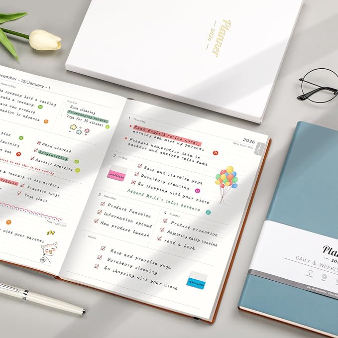 - Comprehensive Planning: This 2026 planner covers everything you need for year-round planning, including Yearly Overview & Schedule, Important Dates, Holidays, Habit Tracker, Yearly Goals, Month Summary, Note Pages, Address Book, Password Organizer, and US time zone map. Special sections facilitate comprehensive planning, while Sticky Notes Divider simplify navigation