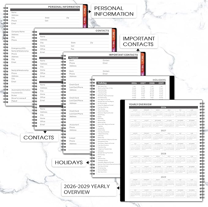- Functional Designs - 36 Months Planning Pages | 36 Months Tabs | Double-side Pocket | Strong Twin-binding | Personal Information Page | 8 Contacts Pages | 4 Important Contacts Pages | 2026-2028 Holidays | 2026-2028 Yearly Overview | 4 Passwords Pages | 9 Notes Pages