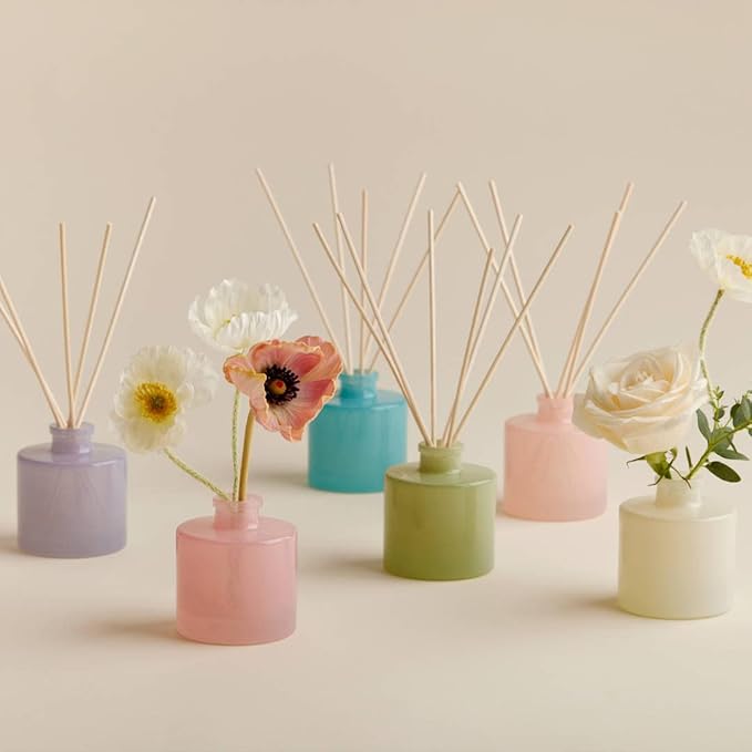 - Thymes Kimono Rose Petite Reed Diffuser Set: Make a statement in full bloom with this flameless way to brighten any space. This classic, floral fragrance is highlighted in the soft pink glass vessel with slender rattan reeds, making this air freshener the perfect housewarming gift.