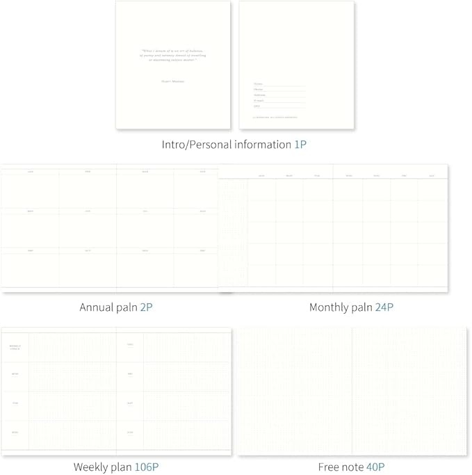 - Inner page Configuration: Intro (1), Personal information page (1), Monthly plan Page (24), Weekly Plan Page (106), Free Note Page (40), Illustration Page (18), TOTAL of 192 Pages