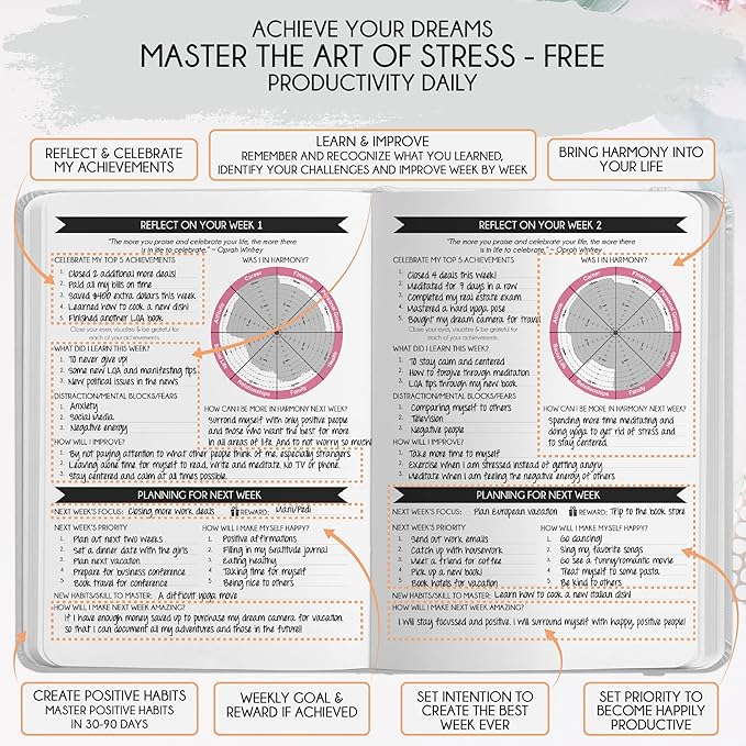 - LUXURIOUS AND TOP QUALITY - Self-care journal for women and men, perfect for entrepreneurs, professionals, college students and everyone who has burning desire to turn dreams into reality! FREE VIDEO MINI-COURSE: You will learn 10-min morning routine used by the most successful people to 10-fold your productivity, focus, happiness & passion! You will master setting goals & fix procrastination!