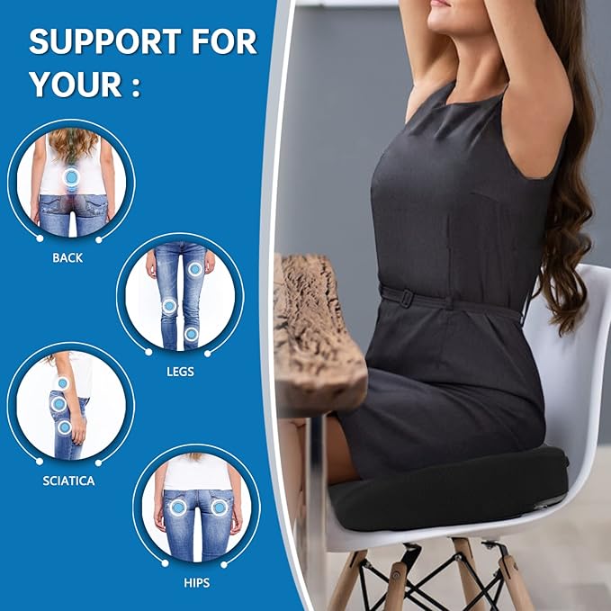 - Comfort & Relief for Back, Legs, Hips, and Sciatica: Designed to provide comfort by alleviating pressure on the lower back, waist, hips, and thighs. Our wheelchair cushion also helps relieve sciatica symptoms, allowing you to power through your day. Its curve design minimizes the pressure that other chair pillows can cause to improve blood circulation.4 INCH memory foam provid adequate support and comfort,suitable for people who is overweight and need seat booster.