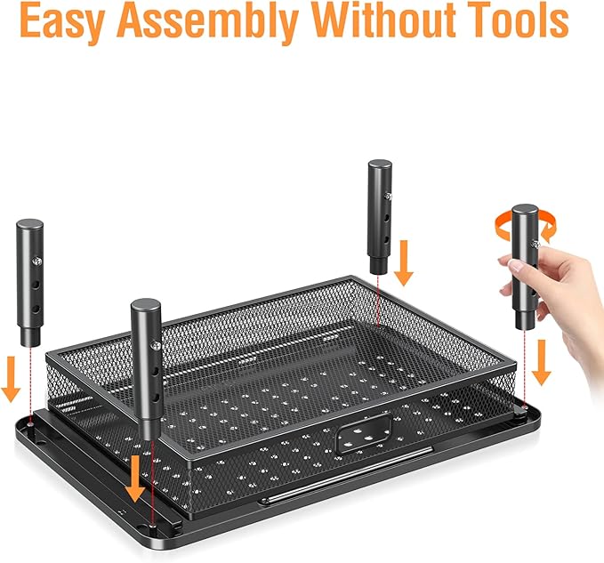 - Super Easy Assembly - Simply screw the four legs into the platform by hand, then insert the drawer and the installation is completed, so that you can get to work quickly and make it more comfortable and effective. The top plate and drawer are made of mesh steel for better airflow and keeping cool of the electronics.