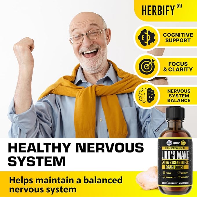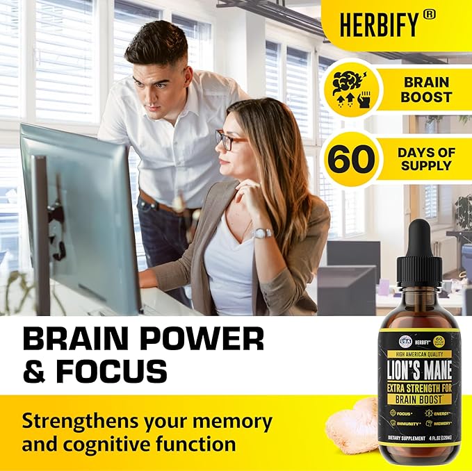 HERBIFY Lions Mane Supplement - Daily Mushroom Supplement for Memory, Focus & Clarity - Brain Booster - Lions Mane Tincture for Immune Support - 4 Fl oz