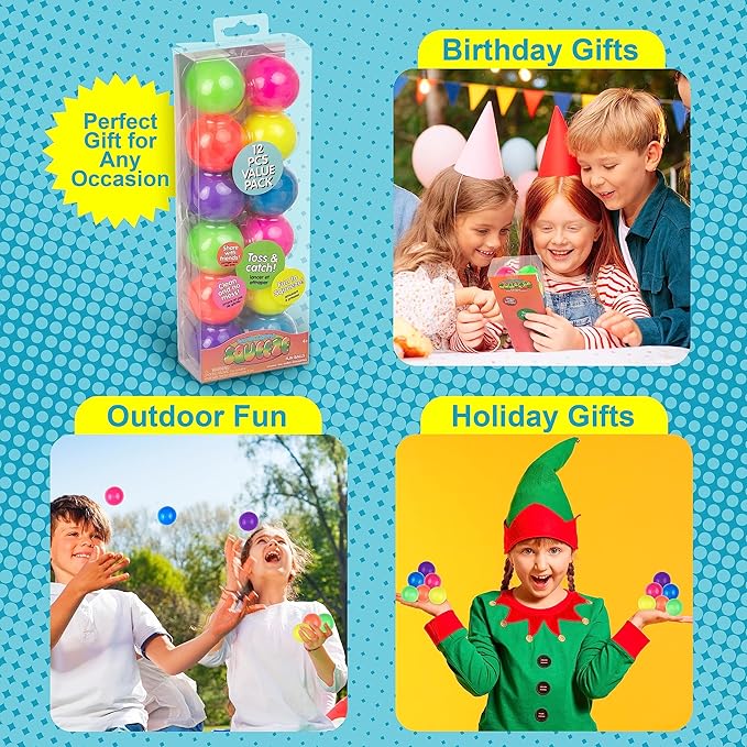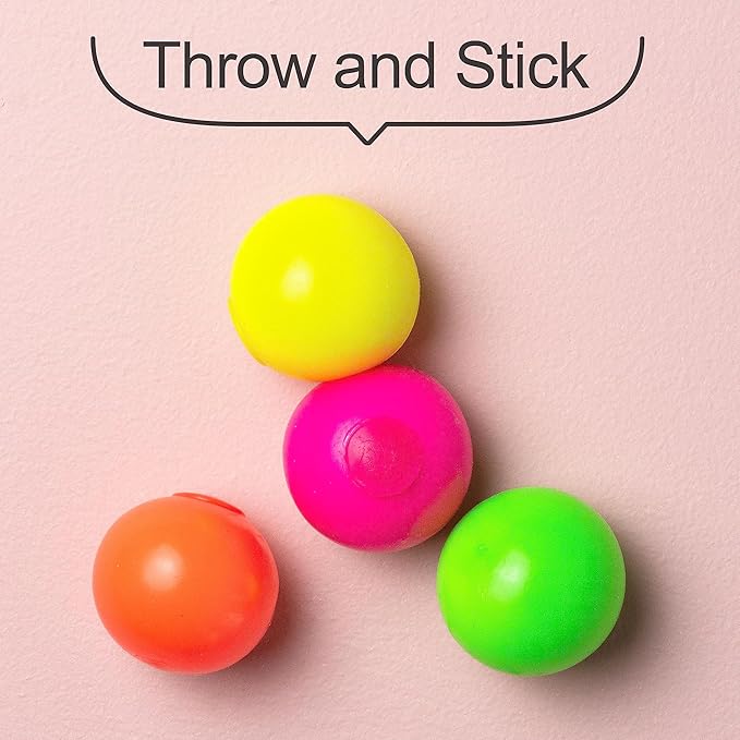 - 12pc Value Pack - These fun squishy toys come in vibrant neon colors and are meant for sticking, stacking, squishing, slinging, and more; these safe, non-toxic anxiety relief items are great stress balls for kids and adults, use them as stress relievers for the office, asmr toys or tradable sticky balls for kids; includes an assortment of neon colors, including green, orange, pink, and yellow