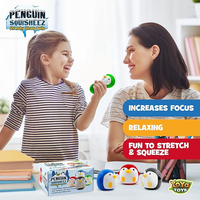 - THESE SQUISHY TOYS ARE OH SO ADORABLE: These cute squish balls are fun and a great way to calm down when emotions are running high. Included are 4 penguin stretchy toys in different colors. They can help with Stress, Anxiety, Relaxation, ADHD and great for Autistic children.