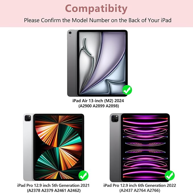 - Compatible Devices : for iPads air 13 inch M2 2024 (Model:A2900/A2899/A2898);for iPads Pro 12.9 inch 6th Gen 2022 (Model:A2436/A2437/A2764/A2766);for iPads Pro 12.9 inch 5th Generation 2021(Model:A2378/A2379/A2461/A2462) for iPads air 13 inch M2 2024 (Model:A2900/A2899/A2898);for iPads Pro 12.9 inch 6th Gen 2022 (Model:A2436/A2437/A2764/A2766);for iPa… See more