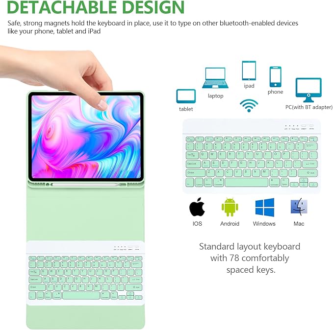 - Slim bluetooth wireless keyboard for ipads keyboard: for iPads air 13 inch/for iPads Pro 12.9 inch 6th/5th Generation 2022/2021 keyboard case is ultra-thin, easy to carry, easy to put into a briefcase, handbag or backpack.12.9 inch ipads pro case with keyboard Detachable bluetooth keyboard combines with our industry-leading keyboard design and adds more spacious scissor-structure keys for a more relaxed and tactile typing experience.