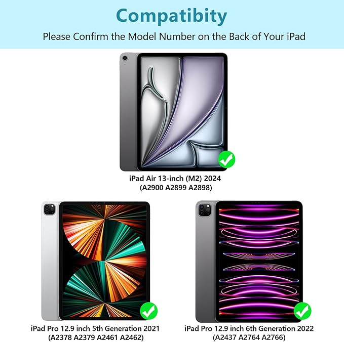 - Case Keyboard Only Applies to 3 iPads Model: Compatible only for iPads air 13 inch M2 2024 (A2900/A2899/A2898) for iPads Pro 12.9 inch 6th Generation 2022 (A2436/A2437/A2764/A2766) for iPads Pro 12.9 inch 5th Generation 2021 (A2378/A2379/A2461/A2462) these 3 iPads models. Please check your iPads model before placing an order.Note: This case keyboard is NOT suitable for the new pro 13 inch M4 2024.