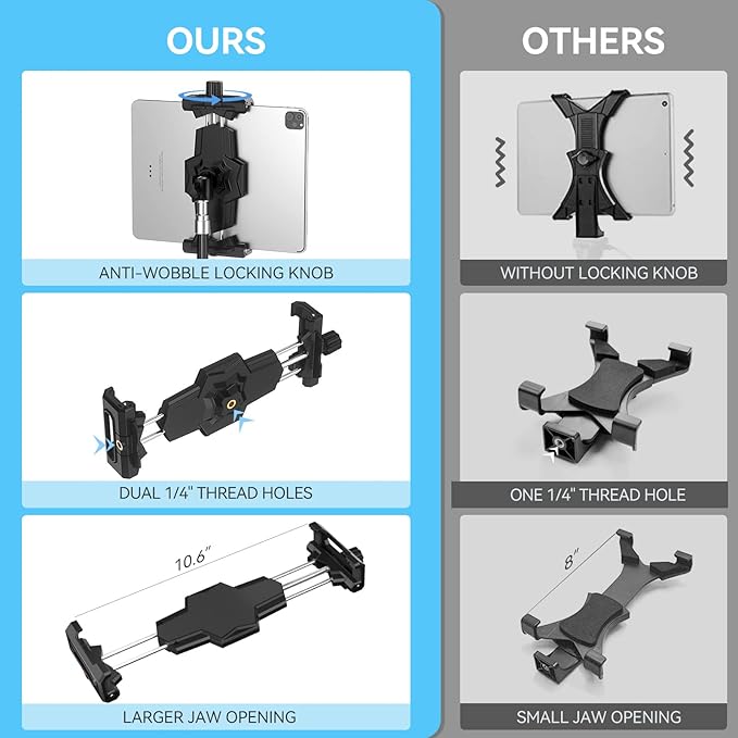 - 【More Stable & Secure】The upgraded iPad tripod mount adapter is built-in reinforcing rib in the middle of the base. Powerful spring-loaded arms and large jaws combined to make sure your device being held steadily. Moreover, the iPad clamp mount base and jaws are covered with non-slip pads to protect your device from scratches and slips, reducing the risk of its falling.