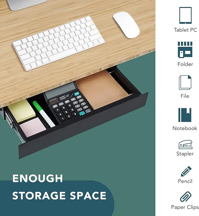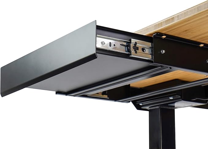- Sleek-looking and Slim Drawer gives it a simple and minimalistic look. This convenient storage drawer mounts under your desk, raises and lowers with it as you adjust heights from sit-to-stand keeping your things in easy reach. The drawer's slim three-inch profile ensures that it won't take up your precious legroom, leaving your knees plenty of space to move.