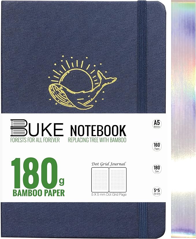 Dot Grid Notebook Dotted Journal,180Gsm Bamboo White Paper, 5 * 5MM Dots 160 Pages, Lay Flat Binding,Colored Silver Edges, Bookmarks and Expandable Back Pocket