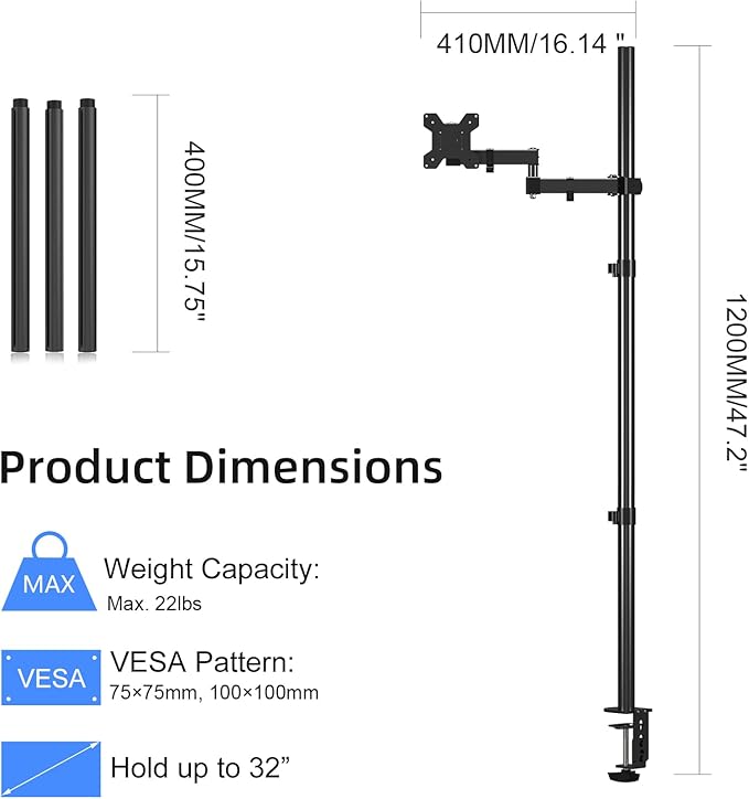- Strong steel arm mounts screen conveniently free up desk space. Hold one 13-32" monitor with a max load capacity 22lbs.