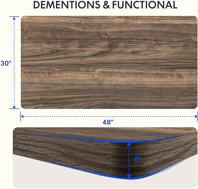 - AMPLE WHOLE-PIECE DESKTOP: With its whole-piece 1” eco-friendly desktop, this standing desk provides plenty of room for your computer setup, documents, and accessories, creating a well-organized and productive work environment. Due to hand measurements, desktop dimensions may vary slightly by 0 to 1”.