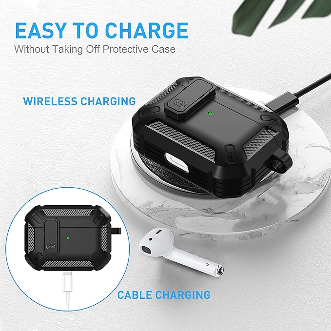 - 【Military AirPods Pro Cover with Secure Lock】 Military shockproof Airpods Pro cover made of TPU and PC materials to makes the AirPods Pro case anti-shock, anti-slip and anti-fingerprint. Secure lock design, easy to open and close top cover with the open button