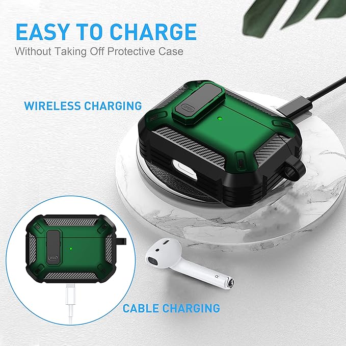 - 【Military AirPods Pro Cover with Secure Lock】 Military shockproof Airpods Pro cover made of TPU and PC materials to makes the AirPods Pro case anti-shock, anti-slip and anti-fingerprint. Secure lock design, easy to open and close top cover with the open button