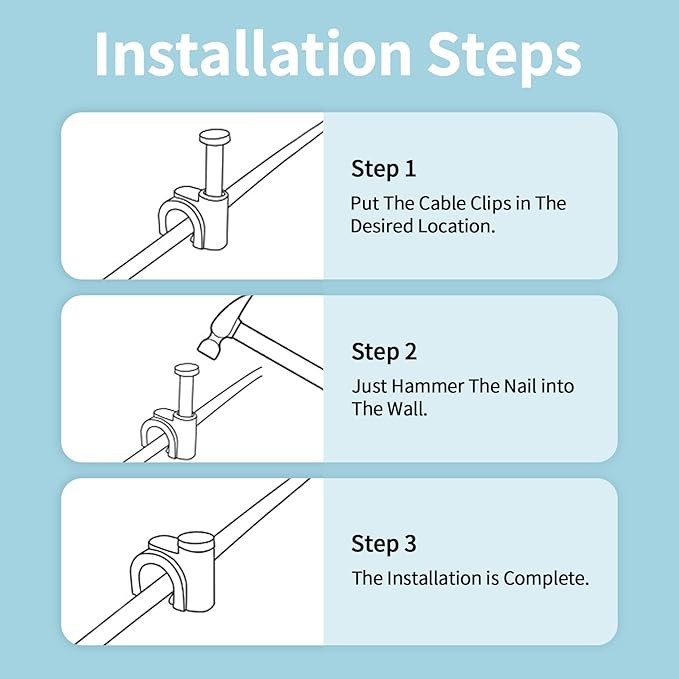 - [ Easy Install ] The installation steps of the wire clip are very simple and can be completed by one person. Insert the cable into the clip slot, hammer the nail into the wall, wood, plaster, brick, etc. With a long nail, it won’t easily fall.