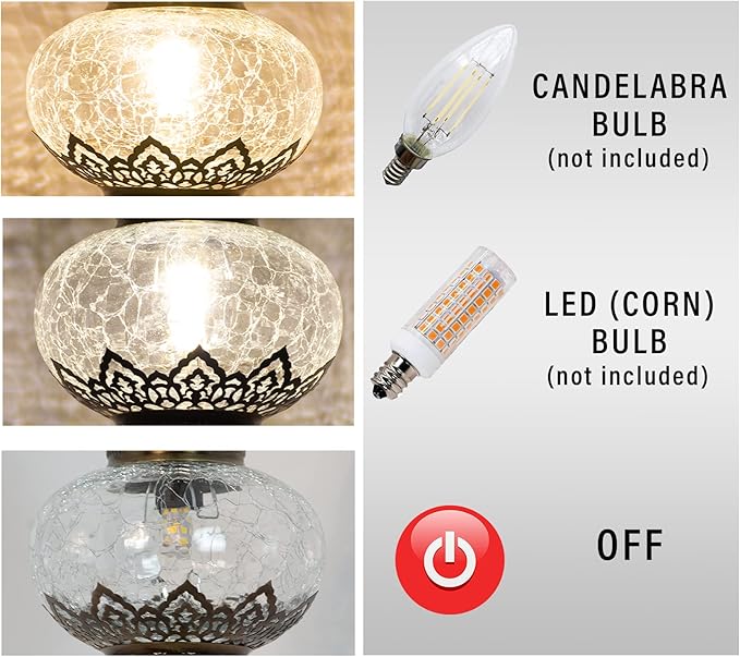 - TYPE OF LIGHT BULB: Turkish table lamps are prepared for USA and Canada with US plug and E12 socket. So you don't need to use any adapters. We recommend using daylight color LED (corn) bulbs for better reflection and illumination. Because the candelabra bulbs are yellow, the mosaic glass pieces may appear different in color and give off a dim light. If you assembly Turkish mosaic table lamp with a white bulb, the mosaic glass globe will reflect a cooler color. (BULB NOT INCLUDED)