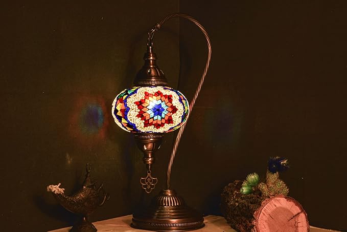 - GREAT FOR GIFTING: This highly sought-after Turkish mosaic desk lamp makes an excellent boho shade for something handcrafted and glow gooseneck lamp to your home decor. Crafted with Moroccan design, multicolor accent lamp will cause a sincere smile on your loved one's face. You can choose the country and bohemian style tiffany lamp with magical Indian harmony that you will give as a gift for the living room, bedroom, kitchen island, restaurants, nightstand, bedside corner, and office.