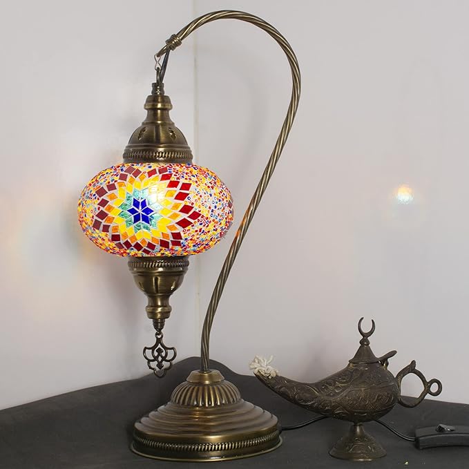 - HANDMADE SWAN NECK: Glass pieces for the mosaic sphere are cut one by one and combined with the mosaic globe. The metal body has been melted and shaped at high temperatures. The metal tube is bent to take the shape of a swan neck and it is given an antique look. Thanks to its aesthetic appearance, it will make a difference in your living room compared to standard table lamps. Turkish lamps will be a great decor that will combine vintage and modern styles.