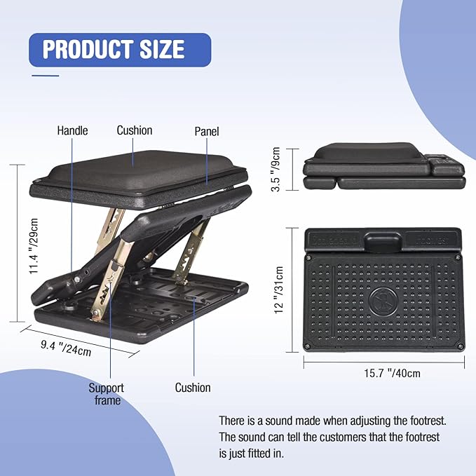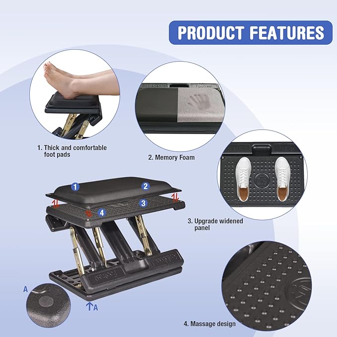 - ♥Friendly Notice: Please refer to the video about how to operate the footrest!!When you sitting on the stool, you cannot sit on the edge of the panel , the max load weight cannot exceed 120 pounds.Life is precious, cherish health, care for the body, take care of your legs and feet, both work at home,in office,this footrest is the ideal choice. You deserve it.