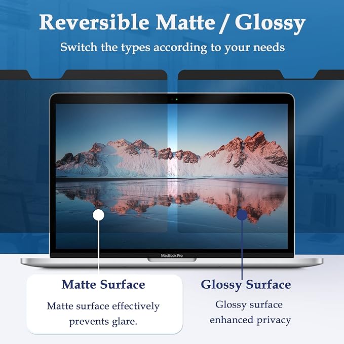 - 【Effective privacy & Anti Glare】 Multi-layered film limits viewing angle to +/- 30 degrees while providing a crystal clear screen straight-on, completely prevent others from peeping at your screen. Our privacy screen MacBook Pro 13 inch is reversible (matte/glossy): Gloss surface enhances privacy, matte surface reduces reflections and block the harmful glare, UV, and blue light by 98%.