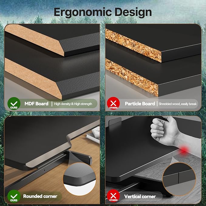 - Ergonomic Design: Adjustable workstation allows you to find healthy balance between sitting or standing throughout the day, the streamlined edge design is beneficial to relieve wrist pain, reduce stress and improve productivity