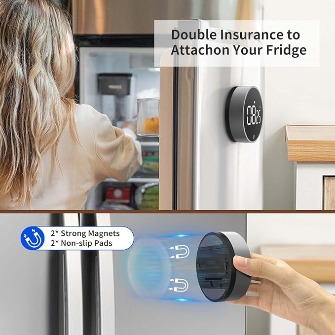 - Time Management & Magnetic - Counting down from 99 minutes 55 seconds to zero, or as a stopwatch count up from 0 to 99:55. Powerful magnets on the back for placement on any iron surface directly. Two silicone pads are added to the back for a more secure attachment to your fridge