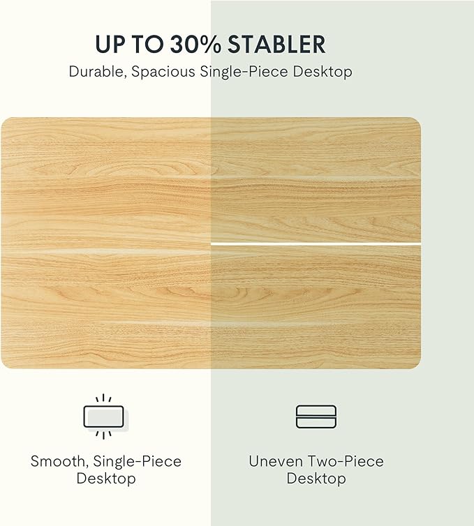 - AMPLE WHOLE-PIECE DESKTOP: With its whole-piece 1” eco-friendly desktop, this standing desk provides plenty of room for your computer setup, documents, and accessories, creating a well-organized and productive work environment. Due to hand measurements, desktop dimensions may vary slightly by 0 to 1”.