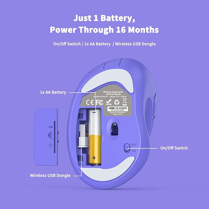 Ergonomic Wireless Mouse with USB Receiver for PC Computer, Laptop and Desktop, Ergo Mouse Vertical with Silent Clicks Long Battery Life, Up to 1600 DPI & 1 AA Battery Powered, Purple