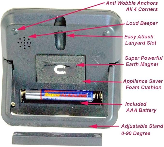 - Strongest Timer Magnet Listed Anywhere: Powerful Neodymium earth magnet & anti-scratch appliance saver foam. Our timers won't slide down your fridge or scratch appliances. Anti-Wobble Stabilizing Anchor Points: Designed on all 4 corners eliminating wobble, pivot, or movement when buttons are pressed while magnet secured. What good is a timer you can’t use while attached? This timer won't pop off your range hood and backflip into your boiling soup because you hit the off button. "No soup fer yu"