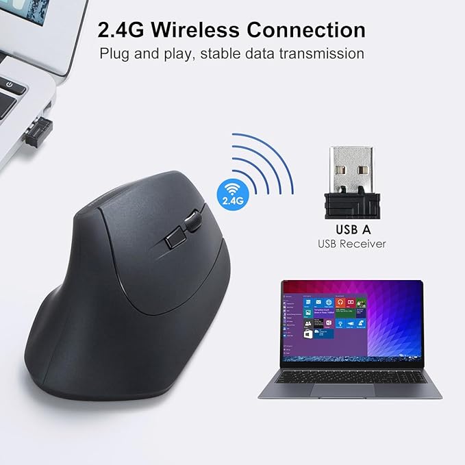 - Ergonomic Design: Place your hand in a natural "handshake" wrist & arm position for smoother movement and less muscle tension. Classic black color and 3D shape fit in the palm of your hand. Once you get used to it, you will love it! 2.4G wireless ergonomic mouse with USB receiver, plug and play, quite convenient and stable.