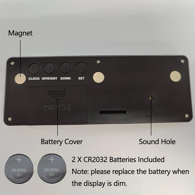 - ✔️EASY TO SET: Hold on the SET button to set the countdown timer and hold on the CLOCK button to set the clock. Two ways to place it. It has a little removable stand and 3 inset strong magnets at the back to stick on metal surface.