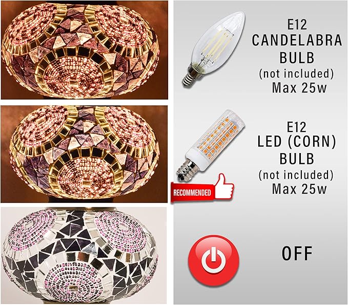 - LIGHT BULB INFO: Metal base of the lamp has E12 socket suitable for US/CA. We recommend that you install an LED (corn) bulb, which you can use for a longer time and get better reflection. Please note that it is not higher than 25 watts! Candelabra bulb absorbs the glass color due to its yellow light and causes you to receive less light. At this time, yellow glass pieces can be reflected as orangeish, and blue glass pieces can be reflected as greenish. Photos were taken with a Led (corn) bulb.