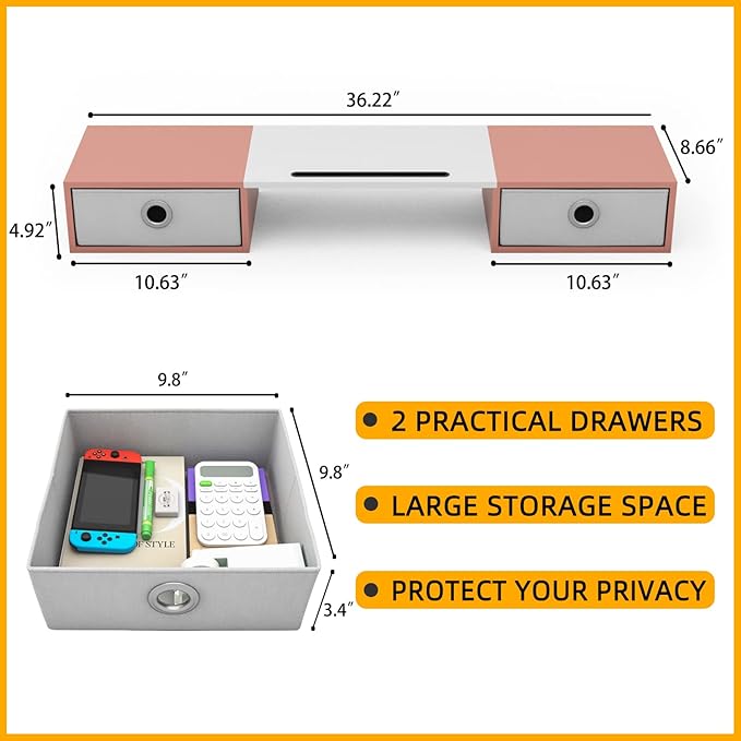 - 【Monitor Stand with 2 Drawers】Our computer monitor riser includes practicality slide-out drawers, for storing items like post-it notes, writing utensils and mobile devices.