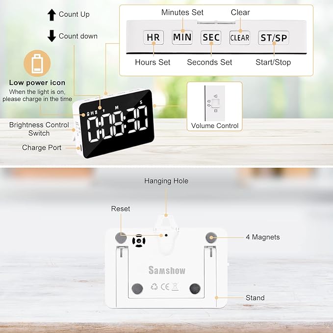 - Rechargeable Counting Down/up Kitchen Timer--The large digital timer countdown from 9:59:59 to 0:00:00, or as a stopwatch from 0:00:00 to 9:59:59; The magnetic kitchen timers is rechargeable, timers come with the Typ-c charging cable. With this rechargeable digital timer, you no longer have to worry about changing batteries frequently.