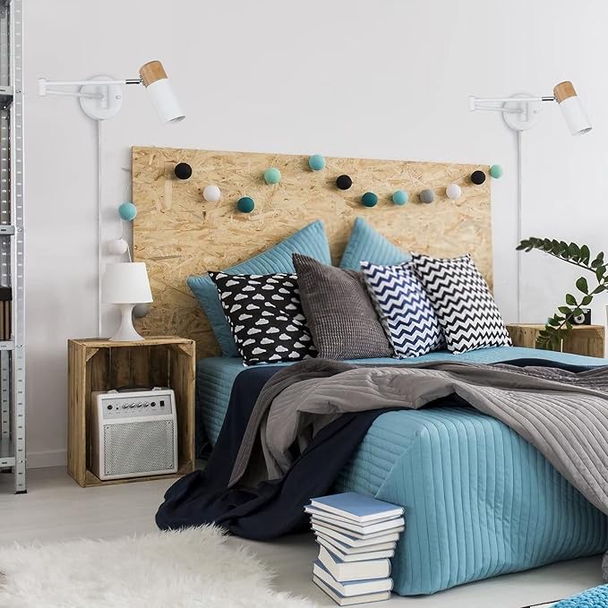 - 【Elegance and Simplicity Design】This fashion plug in wall sconces adopts modern europeanism design style. The metal mounting base, swing arm and lampshade finished with matte white paint, together with the natural color solid wood lampholder, make this lamp look very delicate and beautiful. In fact, this wall lamp can be well matched with various decorative styles, such as modern, contemporary, mid-century, farmhouse, industrial, retro, vintage, rural and so on.