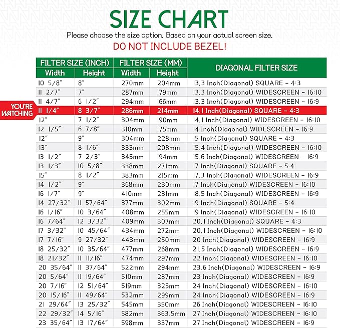 - ☘️ FILTER DIMENSIONS - Width: 11 1/4" (286 mm), Height: 8 3/7" (214 mm), Diagonal: 14.1" ANBAC ATTACHMENT TYPE PRIVACY SCREEN FILTER is compatible with all major brands such as HP, Dell, Samsung, Lenovo, LG, Acer, ASUS, ViewSonic, and the others. Please check your screen's width and height measurement in order to purchase the right filter for your screen size. (We advise that you DO NOT DECIDE your order only based on your screen’s diagonal size).