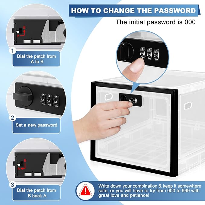 - Notice: Please don’t use this locking box to store valuables things, great for keeping non valuables safe.Make sure the three-digit code you set up stays in a straight. Please remember your password, once you forget it, you will not be able to open the box