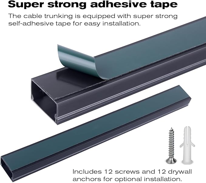 - Quick & Easy Installation -Cable ducts come with sturdy self-adhesive tape for easy installation. Includes 12 screws and 12 drywall anchors for optional installation. You can choose to use peel and stick tape or drywall anchors with screws depending on your surface conditions, great for cable management for wall mounted TVs or monitors.
