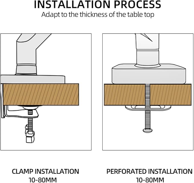 - Easy to Assemble: 10 minutes to install. Includes c-clamp and grommet base (table top thickness within 3.14") for optional installation. Comes with a clear operating manual and required installation tools, making it easy for even a novice to assemble the monitor arm.