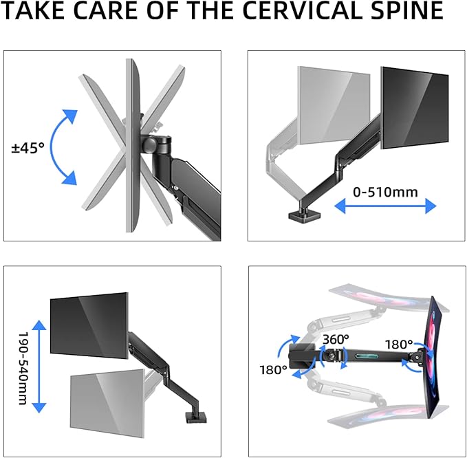 - Ergonomic: The monitor arm can be angled to your heart's desire, offering a wide range of motion, ergonomically. This single monitor arm supports screen rotation 360°, Swivel 180°, and tilt angle from +90°~-45°. The stretch distance can reach 20.47". It greatly improves comfort and work efficiency.