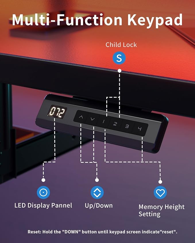 - Memory Height & Anti-Collison Technology: Standing desk has 3 programmable memory height buttons. If the adjustable desk encounters obstacles when lifting, it will move 2cm in the opposite direction to avoid possible damage or injury