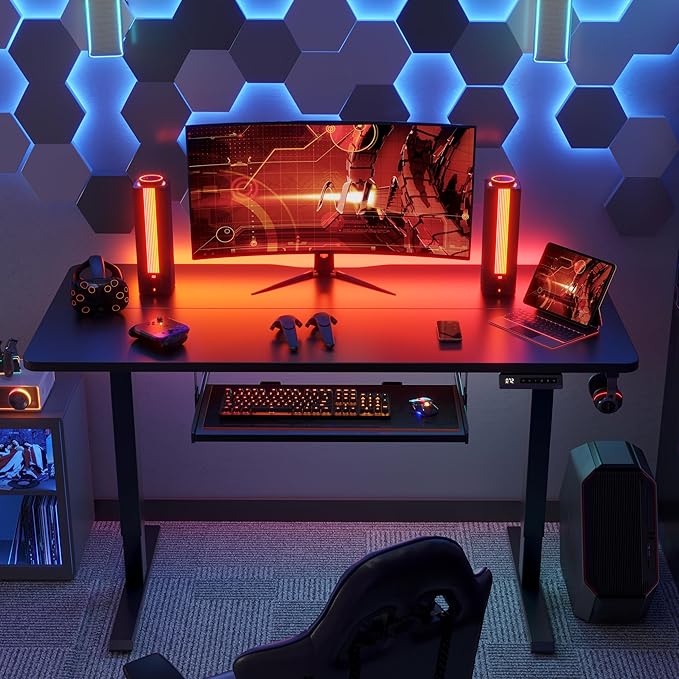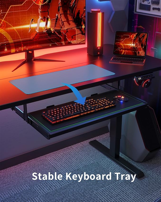 - Exclusively Designed Keyboard Tray & Hooks: The stand up desk is configured with a slide-out keyboard tray (23.2'' X 9.8''). Under table hooks (2pcs) are also included. You could enjoy a larger and tidier desktop space