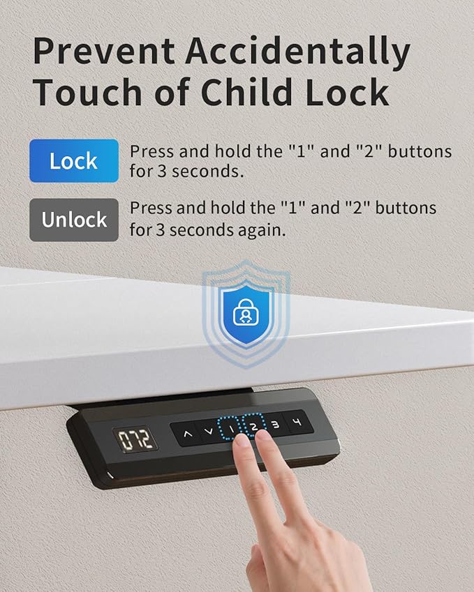 - Memory Height & Anti-Collison Technology: Standing desk has 3 programmable memory height buttons. If the adjustable desk encounters obstacles when lifting, it will move 2cm in the opposite direction to avoid possible damage or injury