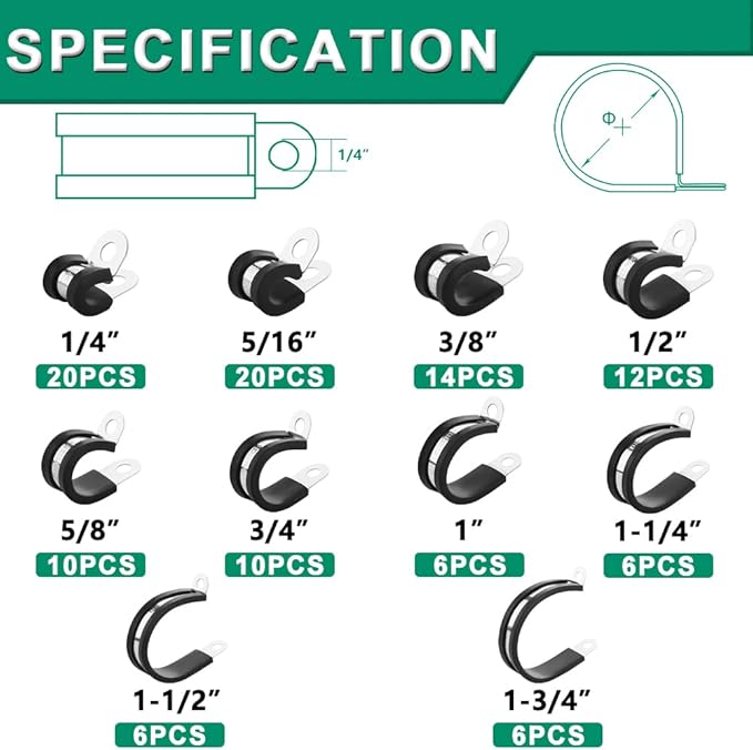 110PCS Cable Clamps Assortment Kit,10 Sizes—1/4" 5/16" 3/8" 1/2" 5/8" 3/4" 1" 1-1/4" 1-1/2" 1-3/4" Stainless Steel Rubber Coated Cushioned Insulated Cable Clamp,Automotive Wire Pipe Clamps