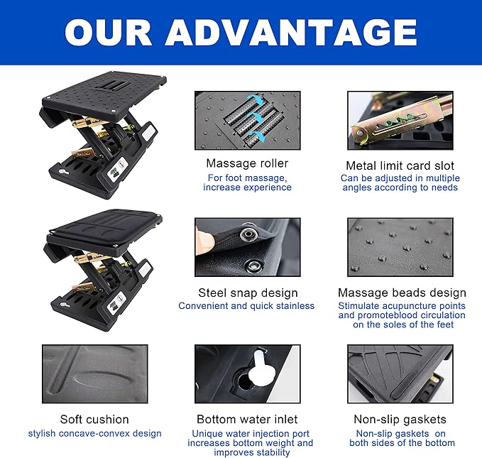 - [Materials used and characteristics]: Foot Rest For Chair The plastic part is made of (PE material + blow molding process), under desk foot rest which not only guarantees the strength but also ENSURES THE LIGHTNESS of desk foot rest ergonomic, under desk foot stool metal part (using color steel plate + cold forming stamping process) is beautiful and strong,under desk foot rest for office can carry a maximum weight of 75lb