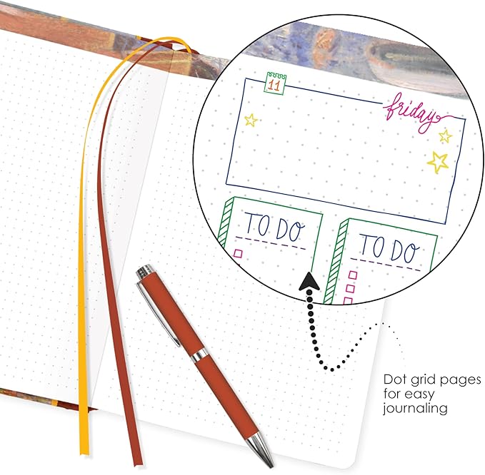 - Soft-touch vegan leather cover with lay-flat binding. Elastic closure band and pen loop.