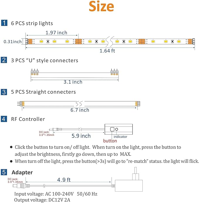 - DIY LED light strip: 6 PCS pre-cut strips, total 9.8 ft,many kinds of connection option,Great way to upgrade your cabinets,closet,desk,bookshelf,bed,wardrobe,display case,bedroom,workbench etc